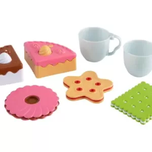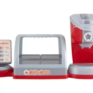 Es una cafetería completa, viene con una exhibidora llena de dulces y dos tazas, además de un panel que gira 360° para jugar a comprar y vender.