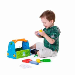 Herramientas con estupendos colores para crear, armar y desarmar! El juego incluye casco, pinza, destornillador, llave de tubo, llave inglesa, serrucho de mano, que hace ruido al igual que el real, martillo.