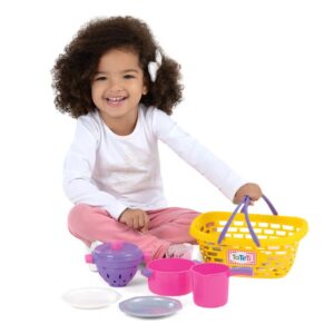 Esta increíble cesta viene con dos tazas, dos platos, una jarra de leche, una sartén, un colador y cubiertos variados. ¡Todo lo que los más pequeños necesitan para sentirse como grandes chefs en la cocina!
