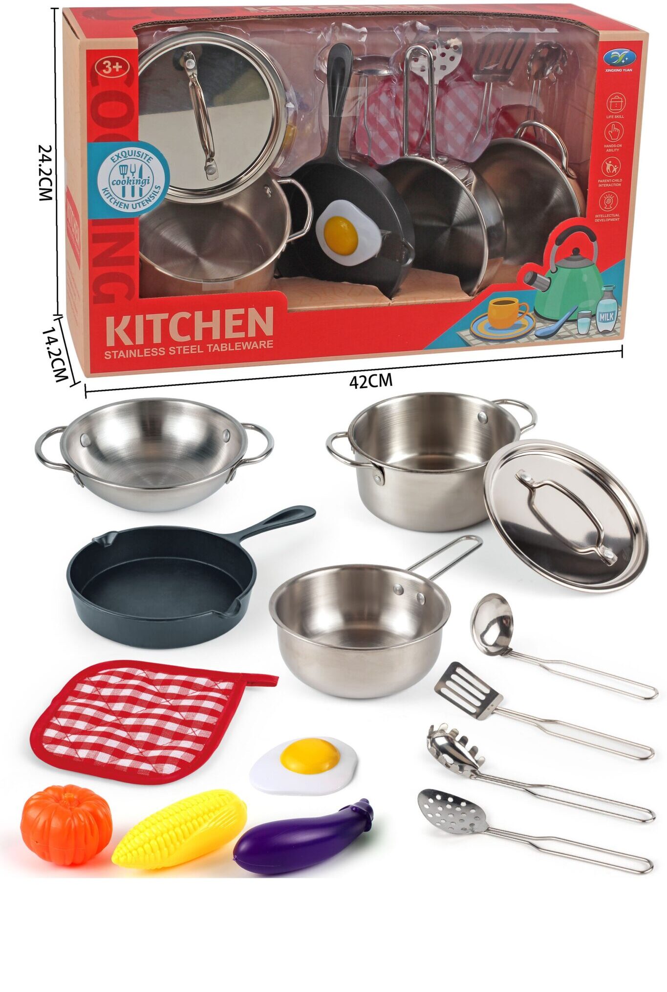 JUEGO DE COCINA DE ACERO EN CAJA, CON ACCESORIOS Y ALIMENTOS