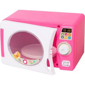 ¡Jugar hacer la comida! El microondas viene con hermosos colores para configurar la cocina. El botón gira para establecer la hora y hace un ruido como el de mamá para advertirte cuando la comida está lista. El juego se completa con dos juegos de platos, vasos y cubiertos.