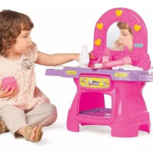 Así es, con espejo y varios accesorios para jugar con la clase. El tocador viene con joyero, mini portaretratos y frascos de perfume para que la producción esté completa.