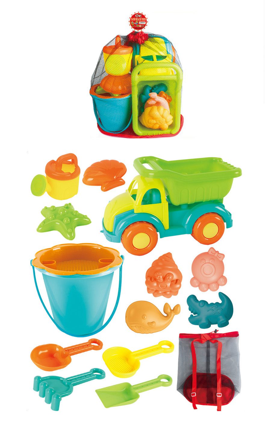 MOCHILA DE RED CON BALDE, CAMION Y ACCESORIOS PARA LA PLAYA.