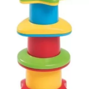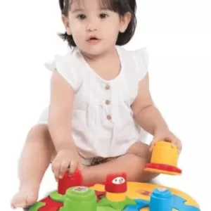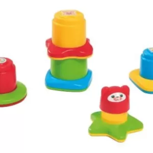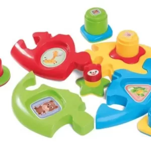 La base es un gran rompecabezas con colores fuertes y piezas enormes para encajar. Arriba, el juego continúa con el encaje de las piezas didácticas combinando formas de estrella, triángulo, círculo y cuadrado y figuras de los animales. ¡Las piezas también son apilables! ¡El juego consistirá en montar y desmontar, apilar y desapilar todo muchas veces!