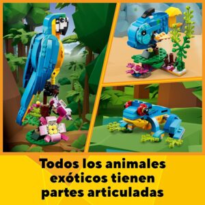 Este set de figuras de animales de juguete LEGO Creator 3 en 1 da a los niños la posibilidad de construir un Loro Exótico posado en la rama de un árbol, una rana juguetona o un pez