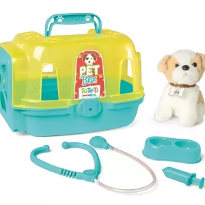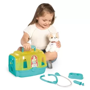 Contiene: Una valija, 1 perrito de peluche, 1 jeringa, 1 estetoscopio, y 1 platito doble para servir agua y comida. todo de juguete.